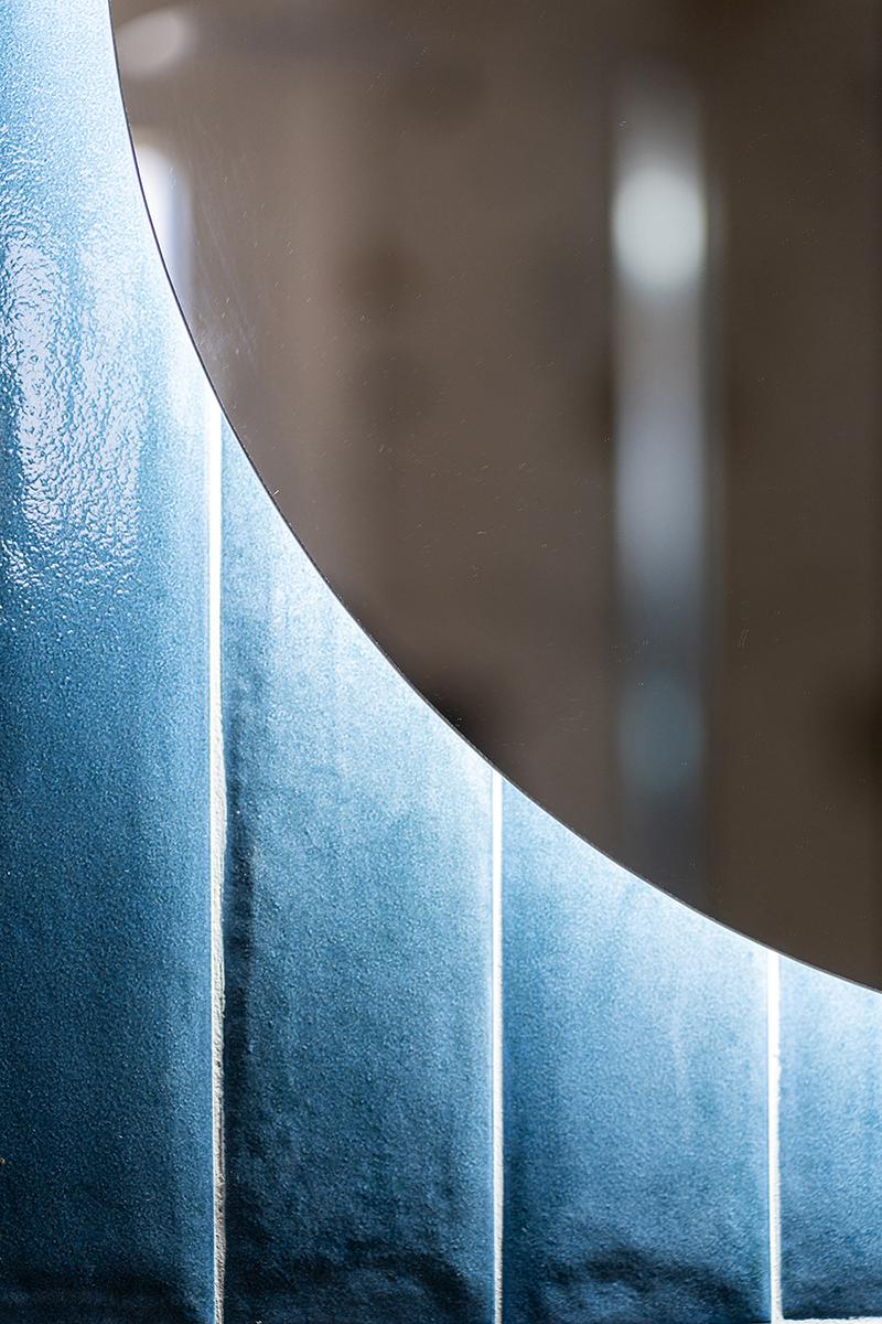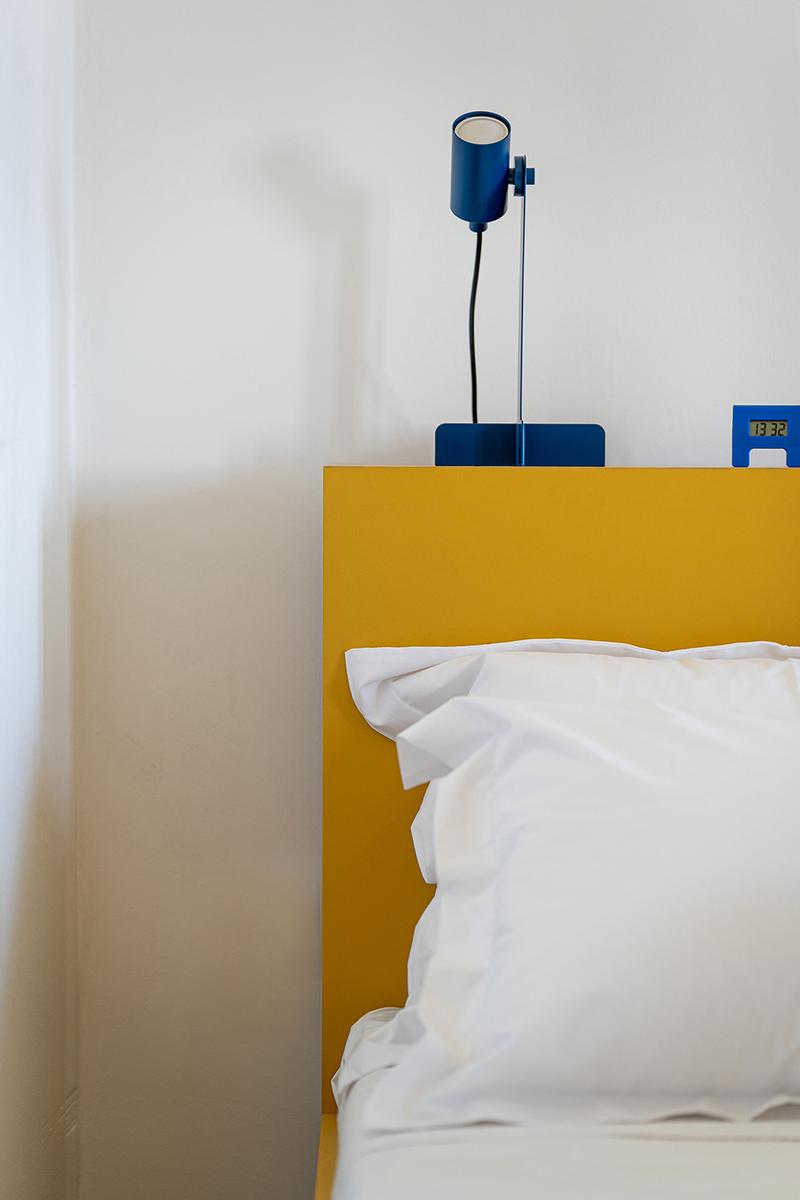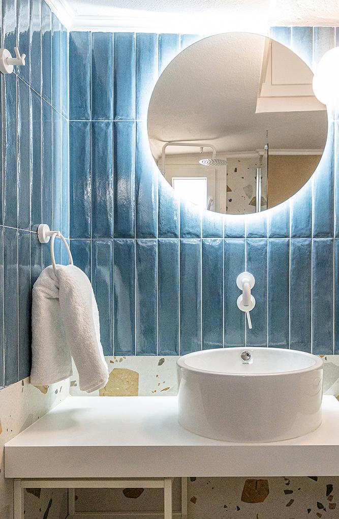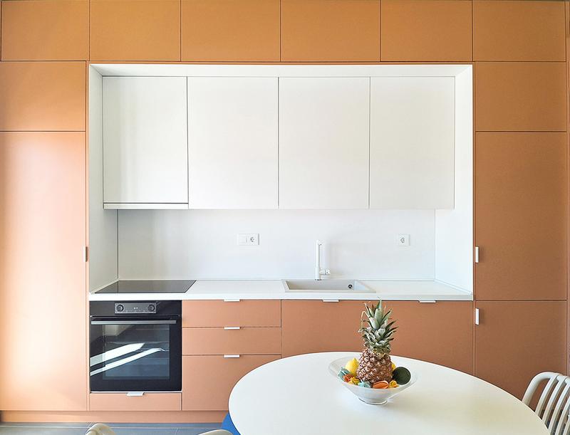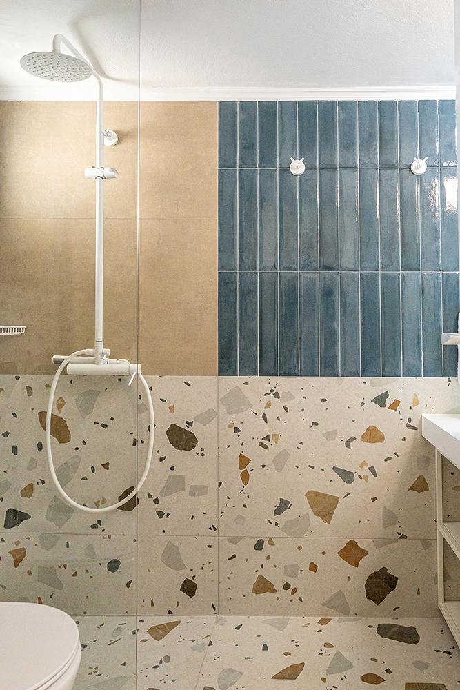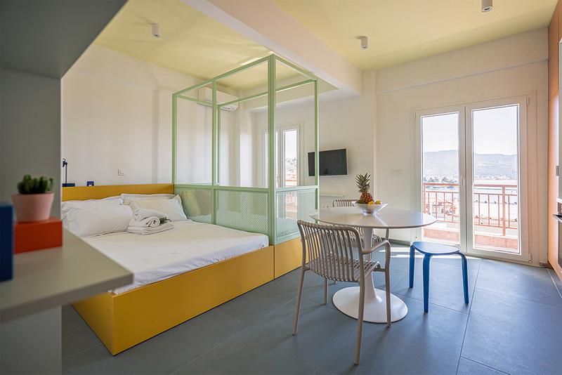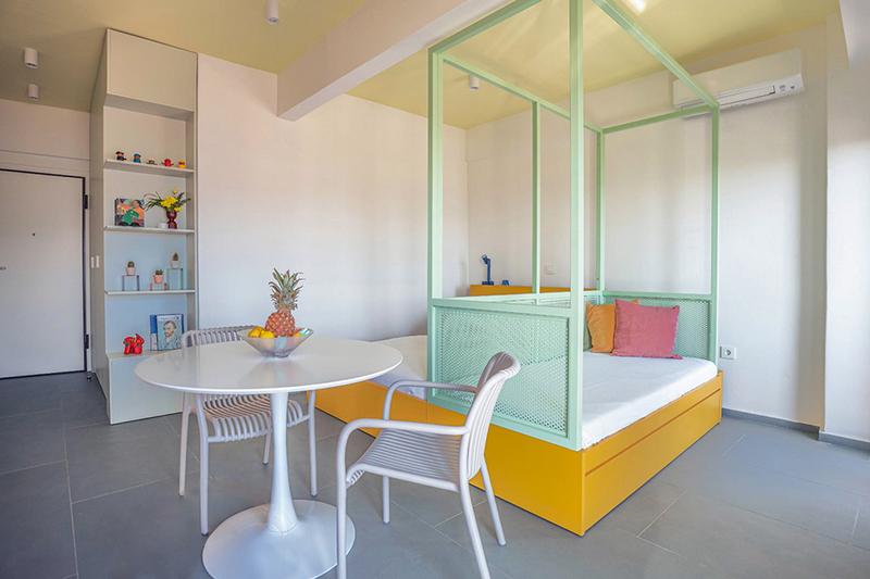 Η χρωματική παλέτα του διαμερίσματος είναι εμπνευσμένη από το καλοκαίρι. Τα έπιπλα έχουν έντονες αποχρώσεις τερακότας, μπλε, κίτρινου και μέντας, οι οποίες ισορροπούν με τις λευκές μονοχρωματικές επιφάνειες. Το μπλε δάπεδο αποτελεί αναφορά στη θάλασσα, ενώ το φωτεινό κίτρινο της οροφής παραπέμπει στον ήλιο, δημιουργώντας ένα διαρκές καλοκαιρινό σκηνικό. Το μπάνιο ακολουθώντας την λογική του υπόλοιπου διαμερίσματος χρησιμοποιεί μωσαϊκό πλακάκι που θυμίζει τους κόκκους άμμου της παραλίας.