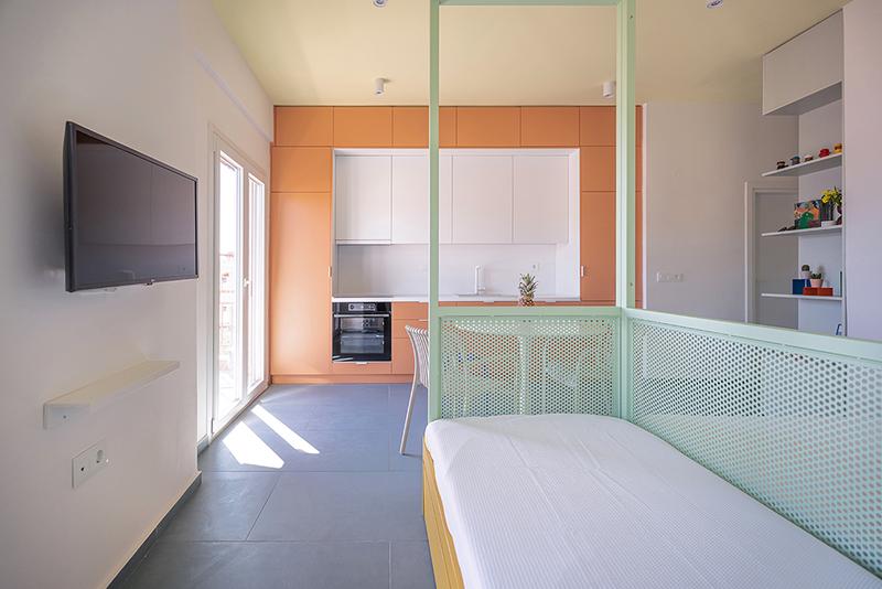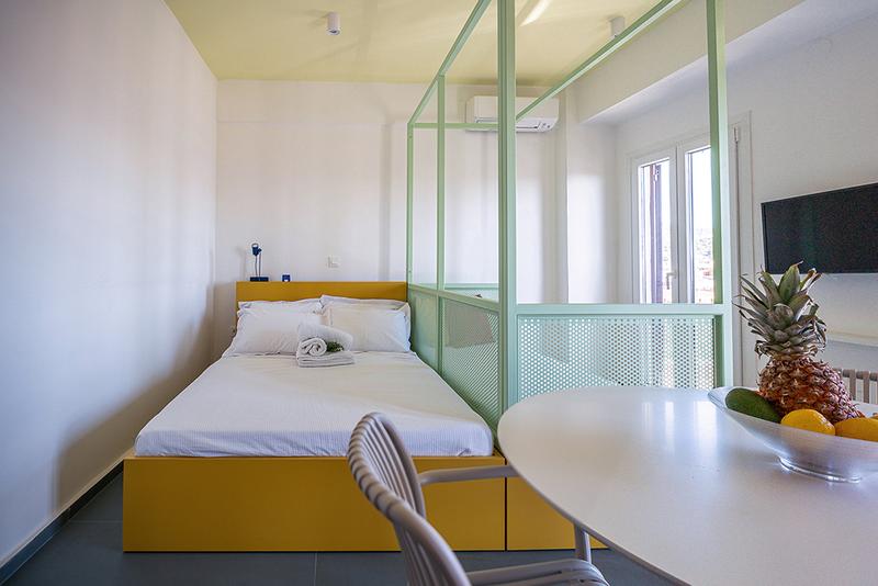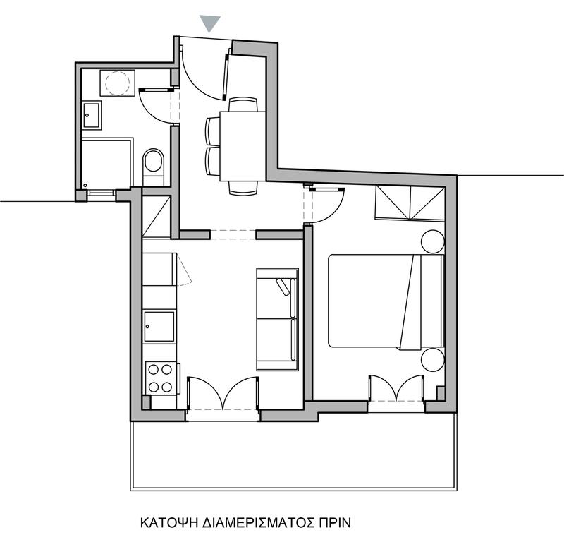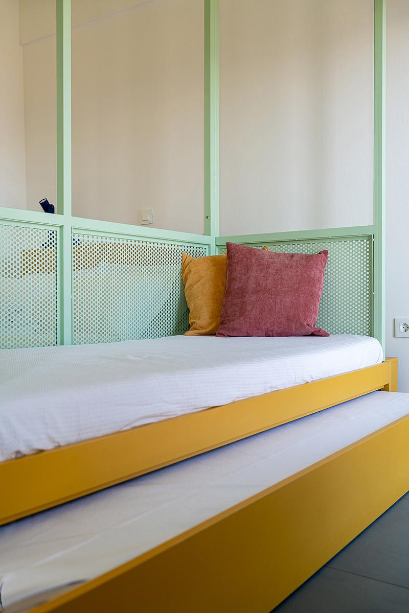Ο σχεδιασμός του διαμερίσματος ανταποκρίνεται στις προκλήσεις ενός περιορισμένου χώρου, με στόχο τη φιλοξενία έως και μίας τετραμελούς οικογένειας. Πρώτο βήμα της επίλυσης υπήρξε η καθαίρεση των διαχωριστικών τοίχων ώστε ο χώρος να διευρυνθεί, προσφέροντας μεγαλύτερη ελευθερία κίνησης και διάχυτο φυσικό φως. Στη θέση τους σχεδιάστηκε μία διαμπερής σιδερένια κατασκευή με διττό χαρακτήρα. Αρχικά χρησιμεύει ως «πλάτη» στον καναπέ-κρεβάτι ο οποίος στρέφεται προς τη θέα της θάλασσας και το ξενοδοχείο Πόρτο Καρράς. Ταυτόχρονα η κατασκευή αυτή αποτελεί διαχωριστικό στοιχείο ανάμεσα στο διπλό και το μονό κρεβάτι, προσφέροντας ιδιωτικότητα. Κάτω από το μονό κρεβάτι υπάρχει συρόμενο επιπλέον κρεβάτι, επιτρέποντας στα μέλη της οικογένειας να κοιμούνται εν σειρά, παραπέμποντας στις παραδοσιακές μονόχωρες καλοκαιρινές κατοικίες.